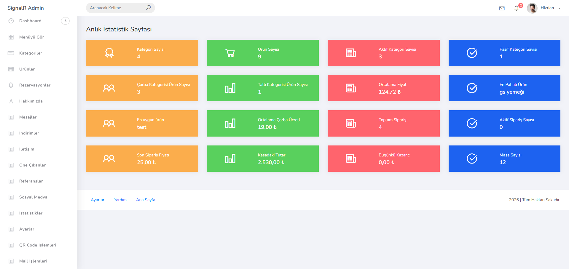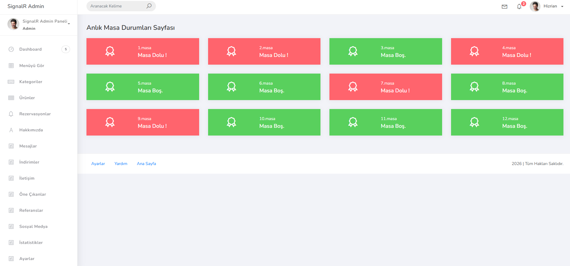 Proje Amacı ve Gerçek Zamanlı İletişim: Bu proje, klasik HTTP istek-yanıt döngüsünün ötesine geçerek; SignalR teknolojisi ile sunucu ve istemci arasında kesintisiz (Persistent) bir veri kanalı oluşturur. Sipariş durumları, masa bildirimleri ve anlık istatistikler, sayfa yenilenmesine gerek kalmadan Web Socket protokolü üzerinden milisaniyeler içinde Dashboard'a yansıtılmaktadır.